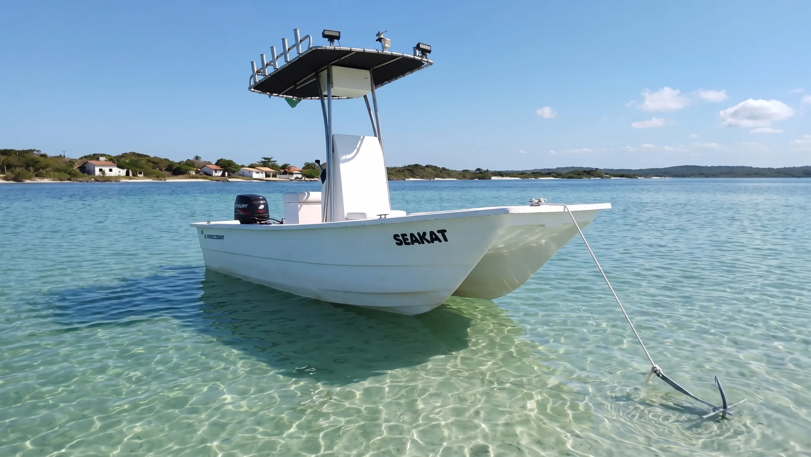 Mar aberto, lagoa, rio — este catamarã foi feito para onde a água te chamar. Com calado de apenas 19cm, você acessa onde a maioria das lanchas simplesmente não consegue chegar.